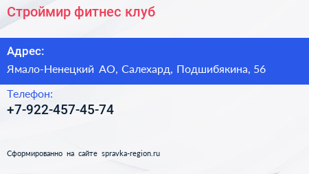 Строймир, фитнес-клуб по адресу Ямало-Ненецкий АО, Салехард, Подшибякина, 56 в дальнейшем Организация, размещена в следующих категориях: