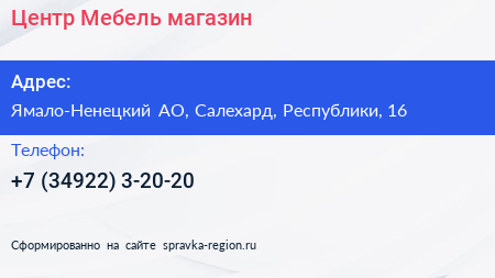 Центр Мебель, магазин по адресу Ямало-Ненецкий АО, Салехард, Республики, 16 в дальнейшем Организация, размещена в следующих категориях: