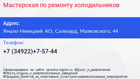 Мастерская по ремонту холодильников по адресу Ямало-Ненецкий АО, Салехард, Маяковского, 44 в дальнейшем Организация, размещена в следующих категориях: