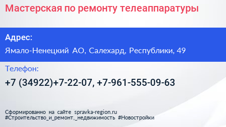 Мастерская по ремонту телеаппаратуры по адресу Ямало-Ненецкий АО, Салехард, Республики, 49 в дальнейшем Организация, размещена в следующих категориях: