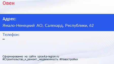Овен по адресу Ямало-Ненецкий АО, Салехард, Республики, 62 в дальнейшем Организация, размещена в следующих категориях:
