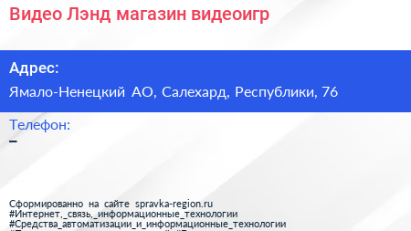 Видео Лэнд, магазин видеоигр по адресу Ямало-Ненецкий АО, Салехард, Республики, 76 в дальнейшем Организация, размещена в следующих категориях: