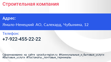 Строительная компания по адресу Ямало-Ненецкий АО, Салехард, Чубынина, 12 в дальнейшем Организация, размещена в следующих категориях: