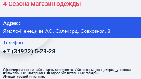 4 Сезона, магазин одежды по адресу Ямало-Ненецкий АО, Салехард, Совхозная, 8 в дальнейшем Организация, размещена в следующих категориях: