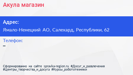 Акула, магазин по адресу Ямало-Ненецкий АО, Салехард, Республики, 62 в дальнейшем Организация, размещена в следующих категориях: