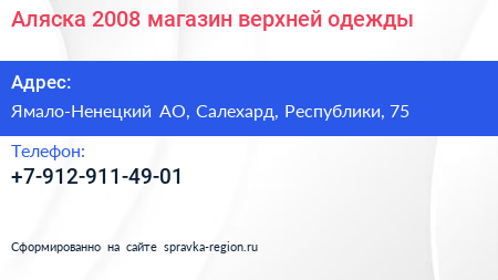 Аляска 2008, магазин верхней одежды по адресу Ямало-Ненецкий АО, Салехард, Республики, 75 в дальнейшем Организация, размещена в следующих категориях: