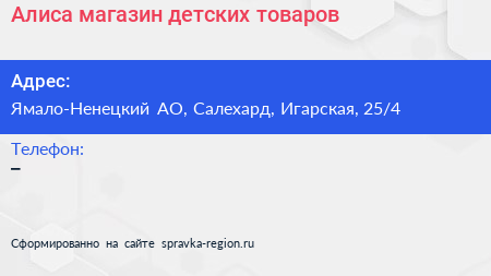 Алиса, магазин детских товаров по адресу Ямало-Ненецкий АО, Салехард, Игарская, 25/4 в дальнейшем Организация, размещена в следующих категориях: