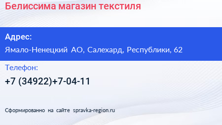 Белиссима, магазин текстиля по адресу Ямало-Ненецкий АО, Салехард, Республики, 62 в дальнейшем Организация, размещена в следующих категориях: