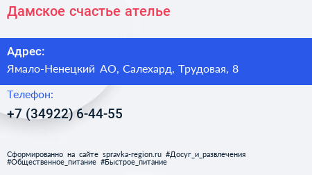 Дамское счастье, ателье по адресу Ямало-Ненецкий АО, Салехард, Трудовая, 8 в дальнейшем Организация, размещена в следующих категориях: