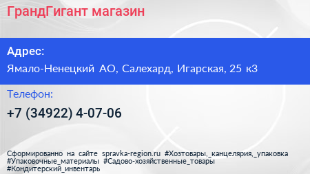 ГрандГигант, магазин по адресу Ямало-Ненецкий АО, Салехард, Игарская, 25 к3 в дальнейшем Организация, размещена в следующих категориях: