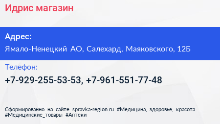 Идрис, магазин по адресу Ямало-Ненецкий АО, Салехард, Маяковского, 12Б в дальнейшем Организация, размещена в следующих категориях: