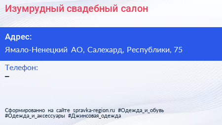 Изумрудный, свадебный салон по адресу Ямало-Ненецкий АО, Салехард, Республики, 75 в дальнейшем Организация, размещена в следующих категориях:
