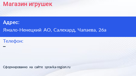 Магазин игрушек по адресу Ямало-Ненецкий АО, Салехард, Чапаева, 26а в дальнейшем Организация, размещена в следующих категориях: