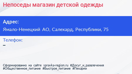 Непоседы, магазин детской одежды по адресу Ямало-Ненецкий АО, Салехард, Республики, 75 в дальнейшем Организация, размещена в следующих категориях: