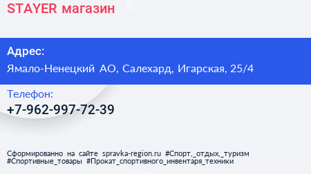 STAYER, магазин по адресу Ямало-Ненецкий АО, Салехард, Игарская, 25/4 в дальнейшем Организация, размещена в следующих категориях: