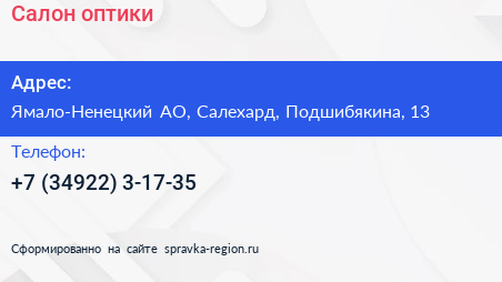 Салон оптики по адресу Ямало-Ненецкий АО, Салехард, Подшибякина, 13 в дальнейшем Организация, размещена в следующих категориях: