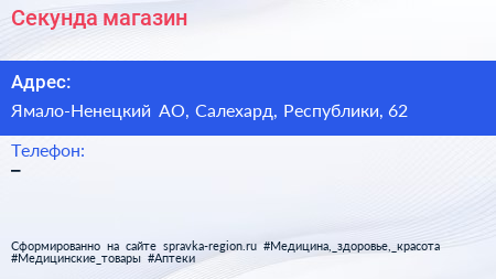Секунда, магазин по адресу Ямало-Ненецкий АО, Салехард, Республики, 62 в дальнейшем Организация, размещена в следующих категориях:
