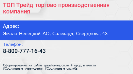 ТОП-Трейд, торгово-производственная компания по адресу Ямало-Ненецкий АО, Салехард, Свердлова, 43 в дальнейшем Организация, размещена в следующих категориях: