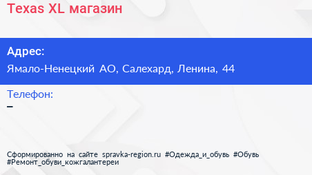 Texas XL, магазин по адресу Ямало-Ненецкий АО, Салехард, Ленина, 44 в дальнейшем Организация, размещена в следующих категориях: