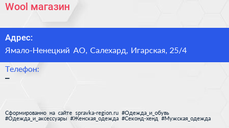 Wool, магазин по адресу Ямало-Ненецкий АО, Салехард, Игарская, 25/4 в дальнейшем Организация, размещена в следующих категориях:
