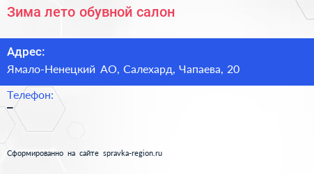Зима лето, обувной салон по адресу Ямало-Ненецкий АО, Салехард, Чапаева, 20 в дальнейшем Организация, размещена в следующих категориях: