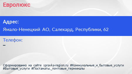 Евролюкс по адресу Ямало-Ненецкий АО, Салехард, Республики, 62 в дальнейшем Организация, размещена в следующих категориях: