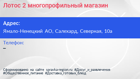 Лотос-2, многопрофильный магазин по адресу Ямало-Ненецкий АО, Салехард, Северная, 10а в дальнейшем Организация, размещена в следующих категориях:
