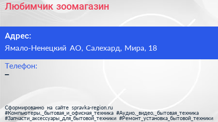 Любимчик, зоомагазин по адресу Ямало-Ненецкий АО, Салехард, Мира, 18 в дальнейшем Организация, размещена в следующих категориях: