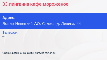 33 пингвина, кафе-мороженое по адресу Ямало-Ненецкий АО, Салехард, Ленина, 44 в дальнейшем Организация, размещена в следующих категориях: