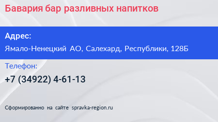 Бавария, бар разливных напитков по адресу Ямало-Ненецкий АО, Салехард, Республики, 128Б в дальнейшем Организация, размещена в следующих категориях: