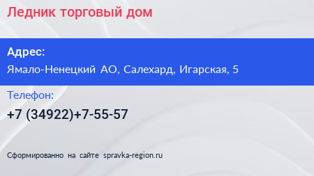 Ледник, торговый дом по адресу Ямало-Ненецкий АО, Салехард, Игарская, 5 в дальнейшем Организация, размещена в следующих категориях: