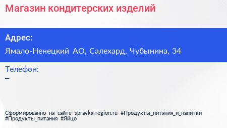 Магазин кондитерских изделий по адресу Ямало-Ненецкий АО, Салехард, Чубынина, 34 в дальнейшем Организация, размещена в следующих категориях: