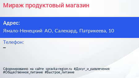 Мираж, продуктовый магазин по адресу Ямало-Ненецкий АО, Салехард, Патрикеева, 10 в дальнейшем Организация, размещена в следующих категориях: