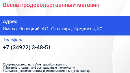 Весна, продовольственный магазин по адресу Ямало-Ненецкий АО, Салехард, Броднева, 30 в дальнейшем Организация, размещена в следующих категориях: