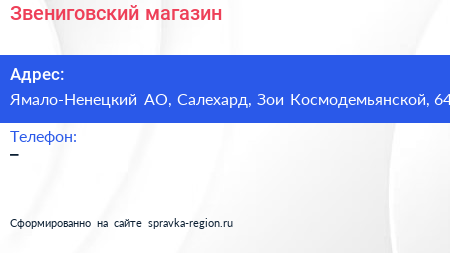 Звениговский, магазин по адресу Ямало-Ненецкий АО, Салехард, Зои Космодемьянской, 64 в дальнейшем Организация, размещена в следующих категориях: