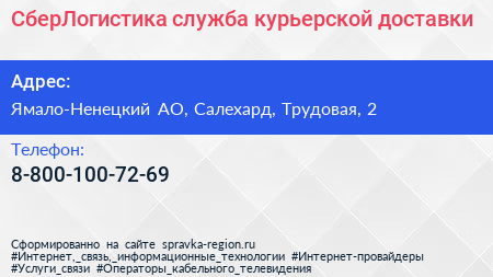 СберЛогистика, служба курьерской доставки по адресу Ямало-Ненецкий АО, Салехард, Трудовая, 2 в дальнейшем Организация, размещена в следующих категориях: