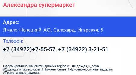 Александра, супермаркет по адресу Ямало-Ненецкий АО, Салехард, Игарская, 5 в дальнейшем Организация, размещена в следующих категориях: