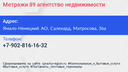 Метражи-89, агентство недвижимости по адресу Ямало-Ненецкий АО, Салехард, Матросова, 36а в дальнейшем Организация, размещена в следующих категориях: