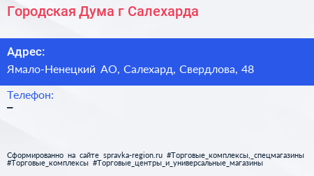 Городская Дума г. Салехарда по адресу Ямало-Ненецкий АО, Салехард, Свердлова, 48 в дальнейшем Организация, размещена в следующих категориях: