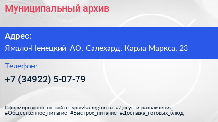 Муниципальный архив по адресу Ямало-Ненецкий АО, Салехард, Карла Маркса, 23 в дальнейшем Организация, размещена в следующих категориях: