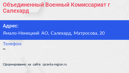 Объединенный Военный Комиссариат г. Салехард по адресу Ямало-Ненецкий АО, Салехард, Матросова, 20 в дальнейшем Организация, размещена в следующих категориях:
