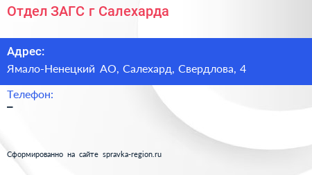 Отдел ЗАГС г. Салехарда по адресу Ямало-Ненецкий АО, Салехард, Свердлова, 4 в дальнейшем Организация, размещена в следующих категориях:
