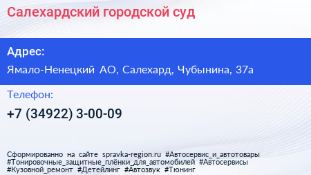 Салехардский городской суд по адресу Ямало-Ненецкий АО, Салехард, Чубынина, 37а в дальнейшем Организация, размещена в следующих категориях: