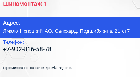 Шиномонтаж №1 по адресу Ямало-Ненецкий АО, Салехард, Подшибякина, 21 ст7 в дальнейшем Организация, размещена в следующих категориях:
