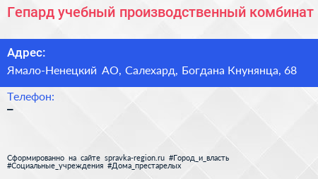 Гепард, учебный производственный комбинат по адресу Ямало-Ненецкий АО, Салехард, Богдана Кнунянца, 68 в дальнейшем Организация, размещена в следующих категориях: