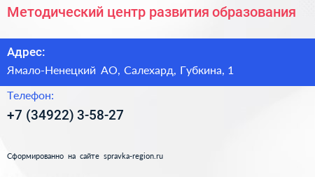 Методический центр развития образования по адресу Ямало-Ненецкий АО, Салехард, Губкина, 1 в дальнейшем Организация, размещена в следующих категориях: