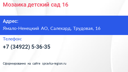 Мозаика, детский сад №16 по адресу Ямало-Ненецкий АО, Салехард, Трудовая, 16 в дальнейшем Организация, размещена в следующих категориях: