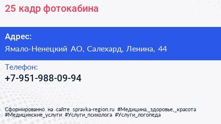 25 кадр, фотокабина по адресу Ямало-Ненецкий АО, Салехард, Ленина, 44 в дальнейшем Организация, размещена в следующих категориях: