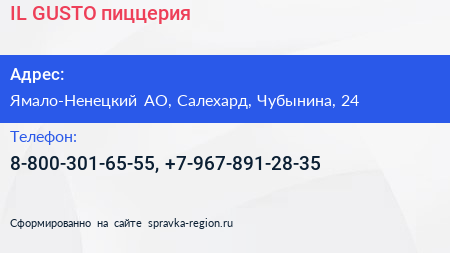 IL GUSTO, пиццерия по адресу Ямало-Ненецкий АО, Салехард, Чубынина, 24 в дальнейшем Организация, размещена в следующих категориях: