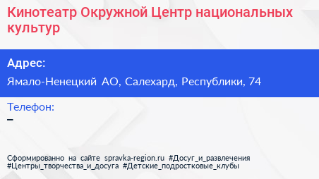 Кинотеатр, Окружной Центр национальных культур по адресу Ямало-Ненецкий АО, Салехард, Республики, 74 в дальнейшем Организация, размещена в следующих категориях: